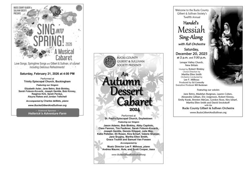 The Bucks County Gilbert & Sullivan Society also performs at community celebrations. Among the events we have participated in are: performing two road shows for Symphony Manor (Feasterville) and the Bucks County Bar Association (Doylestown); singing the National Anthem for the Philadelphia Phillies at Citizens Bank Park, Delaware Valley University Football Games (Doylestown) and the Central Bucks Chamber of Commerce "Spirit of the Nation Breakfast" (Ivyland); assisting with clean-up at the Doylestown Arts Festival; singing Christmas Carols for Discover Doylestown with the brass ensemble from our orchestra for the Annual Tree Lighting and the arrival of Santa Claus; singing for the Annual Christmas Breakfast for Discover Doylestown at the Pine Run Community (Doylestown); performing HMS Pinafore Sing-Along with the Princeton Society of Musical Amateurs (Princeton); and performing a medley of WWI music for the Doylestown Historical Society at the Doylestown Bookshop. The video clip at left show excerpts from our WWI tribute.